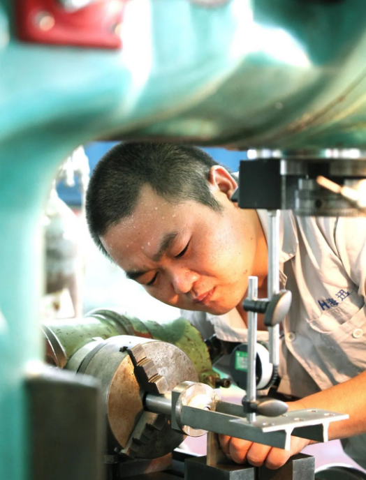 七〇八所海迅公司生產部的員工計師傅雖已汗如雨下,仍專注于銑床加工之中。