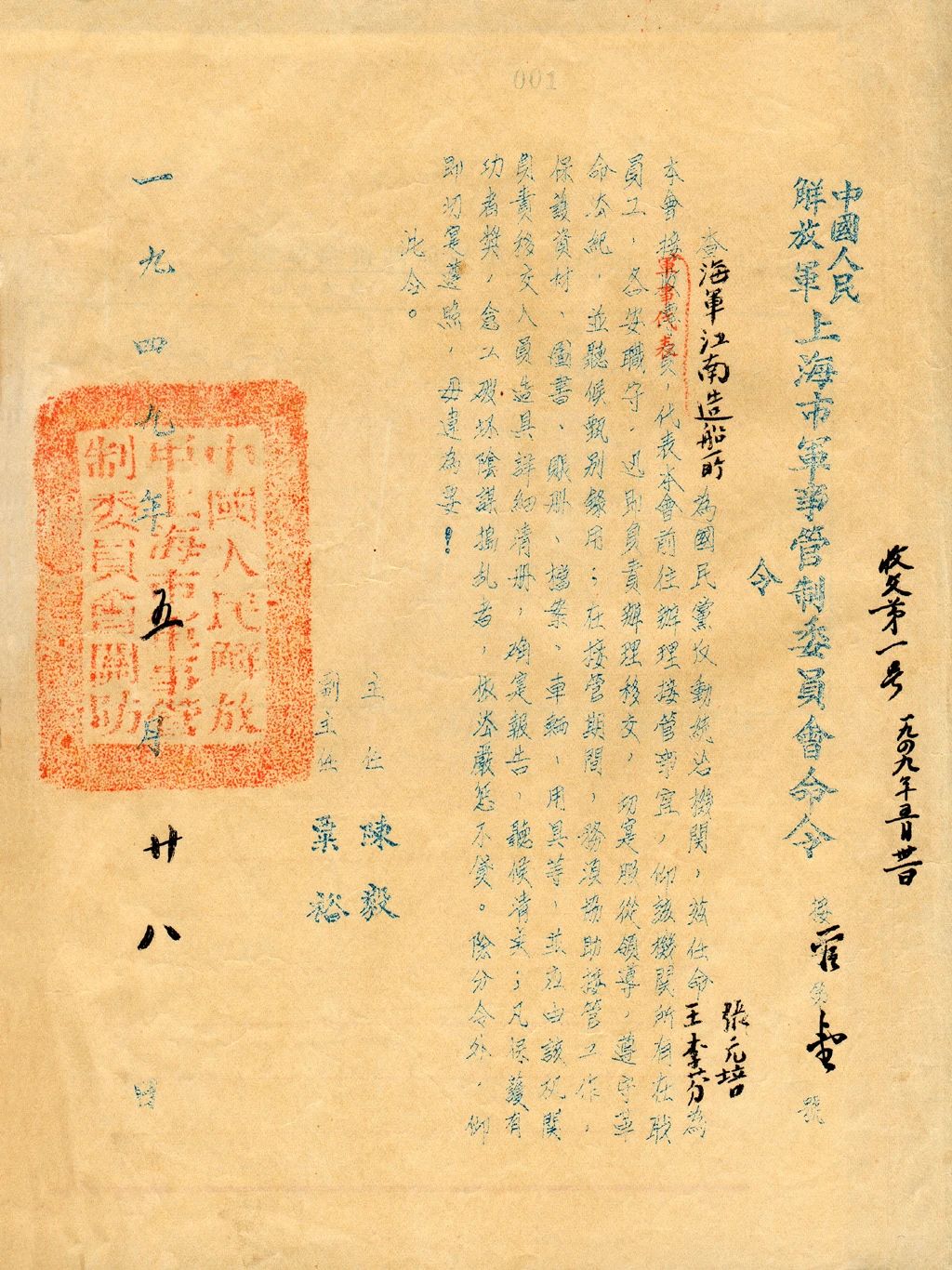 1949年5月上海,1949年5月28日,中國人民解放軍上海市軍事管制委員會發(fā)布第一號“軍管令”,即接管海軍江南造船所。