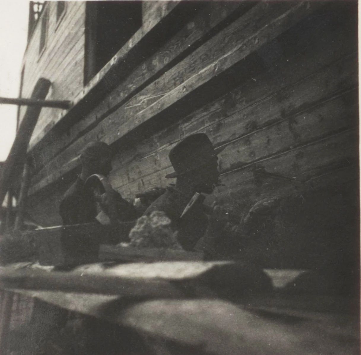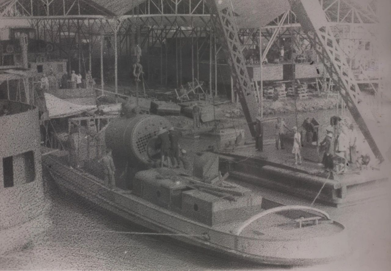 1934年武漢,上世紀30年代,武昌造船成立之初,工人們以手工作業(yè)“敲敲打打”形式開展修造船業(yè)務。修造的船只大多為100~300噸、鋼肋骨與木殼結構,僅有少量是鋼鉚接船體。建造的船只只能在長江上航行跑跑運輸。為了生存和救國,船廠還建造一些農用機械器具、槍支,以輔助民生、支援抗日。