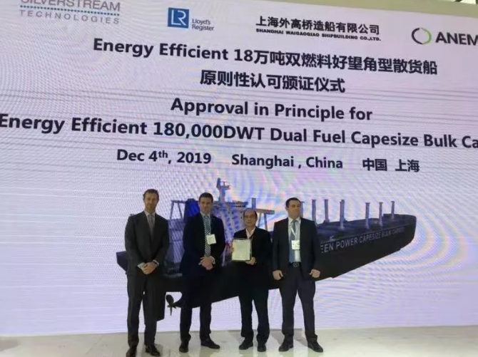 ????12月4日,中國船舶集團所屬上海外高橋造船有限公司隆重推出兩款集多種節能環保技術于一身的“Energy Efficient”18萬噸級雙燃料好望角型散貨船和30萬噸級雙燃料超大型原油船新船型。展會上,英國勞氏船級社為18萬噸級雙燃料好望角型散貨船頒發了AiP證書;英國勞氏船級社和美國船級社為30萬噸級雙燃料超大型原油船頒發了AiP證書。