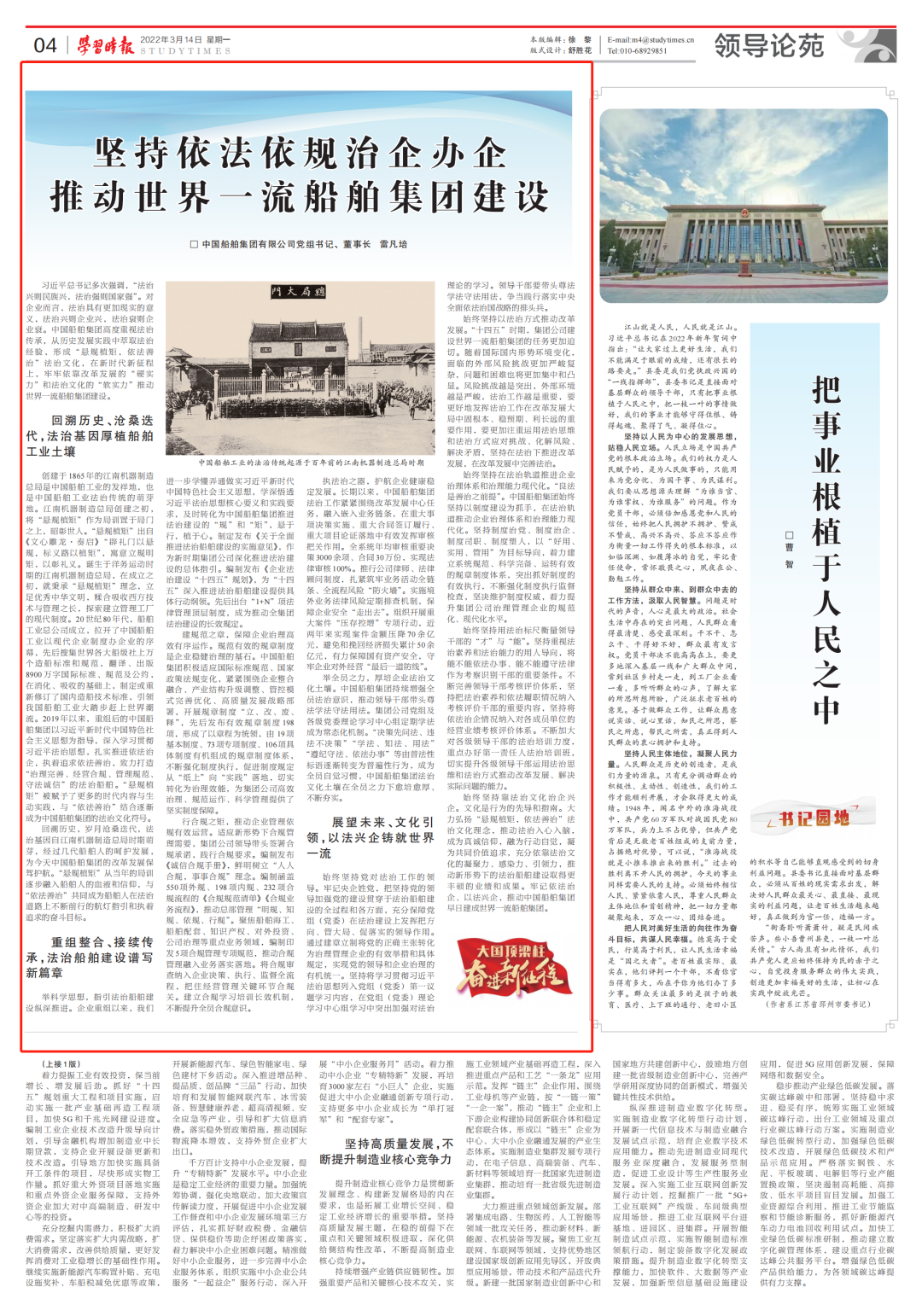 3月14日,《學習時報》刊發中國船舶集團有限公司黨組書記、董事長雷凡培的署名文章《堅持依法依規治企辦企  推動世界一流船舶集團建設》,全文如下: