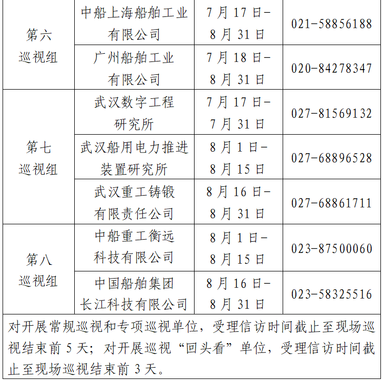 根據(jù)中國船舶集團(tuán)黨組2023年第一輪巡視工作部署,截至2023年7月17日,巡視工作已經(jīng)鋪開。其中,對中國船舶工業(yè)貿(mào)易有限公司、中國船舶集團(tuán)物資有限公司、江蘇自動化研究所、河南柴油機(jī)重工有限責(zé)任公司、中國船舶集團(tuán)有限公司綜合技術(shù)經(jīng)濟(jì)研究院、船舶信息研究中心、中國船舶集團(tuán)國際工程有限公司等7家單位開展常規(guī)巡視,對中船上海船舶工業(yè)有限公司、廣州船舶工業(yè)有限公司等2家單位開展專項(xiàng)巡視,對武漢數(shù)字工程研究所、武漢船用電力推進(jìn)裝置研究所、武漢重工鑄鍛有限責(zé)任公司、中國船舶集團(tuán)長江科技有限公司、中船重工衡遠(yuǎn)科技有限公司等5家單位開展巡視“回頭看”。