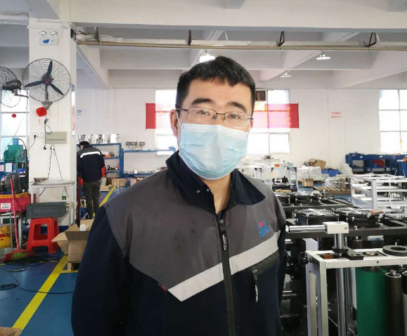 ????徐存培是平面口罩機項目的技術負責人。自接到平面口罩機研制任務以來,他幾乎就“長”在公司里了。他穿梭在各臺平面口罩機間,一會兒墊腳測量放料架距離地面的高度,一會兒彎腰擰緊設備柜里的螺絲,一會兒又緊盯著傳送帶,看無紡布貼合的角度是否精準無誤……