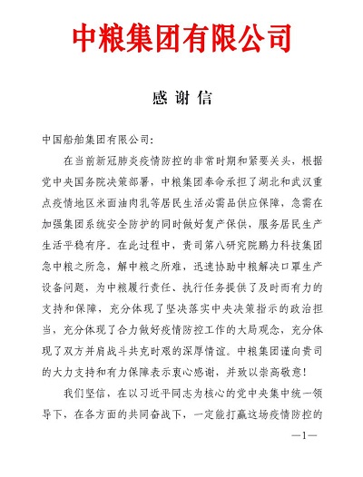 ????在這場戰“疫”中,中國船舶集團沒有缺席——所屬八院鵬力科技集團緊急承擔平面口罩機、N95口罩機、壓條機等醫療物資生產關鍵設備研制攻關任務,以“戰時速度”硬核抗疫。近日,中國石油、中糧集團、中國誠通集團等,紛紛發來感謝信,對鵬力科技集團的全力支持表達深深的謝意。
