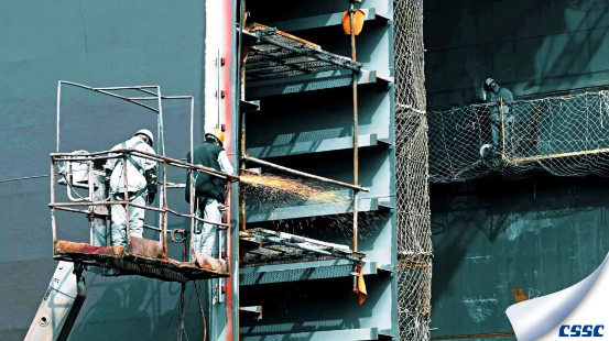 中午,船廠的工人們正在為設備最后調試,龐大的紅色船身和渺小的作業人員,形成了鮮明有趣的對比,正是有千千萬萬小小的我,成就了大大的深藍夢。