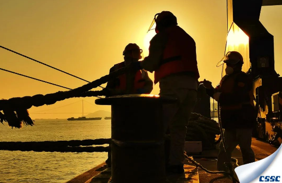 迎著朝陽,中船澄西船舶修造有限公司的帶纜工人們齊心協力,正在為一艘化學品船離泊解纜。