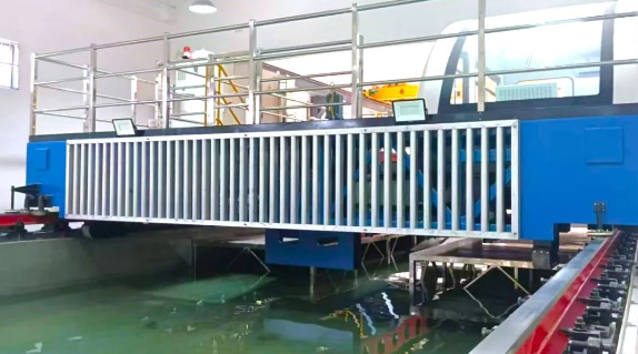 中山大學(xué)“拖曳水池建造” 項(xiàng)目包含了拖曳水池拖車(chē)、軌道系統(tǒng)、造消波系統(tǒng)、造風(fēng)系統(tǒng)等關(guān)鍵試驗(yàn)設(shè)備。拖車(chē)實(shí)現(xiàn)從0.02米/秒到8米/秒的高精度、高速比調(diào)速,滿(mǎn)足拖曳水池流速儀標(biāo)定和船舶試驗(yàn)的雙重需求;造風(fēng)系統(tǒng)實(shí)現(xiàn)了風(fēng)譜模擬能力。