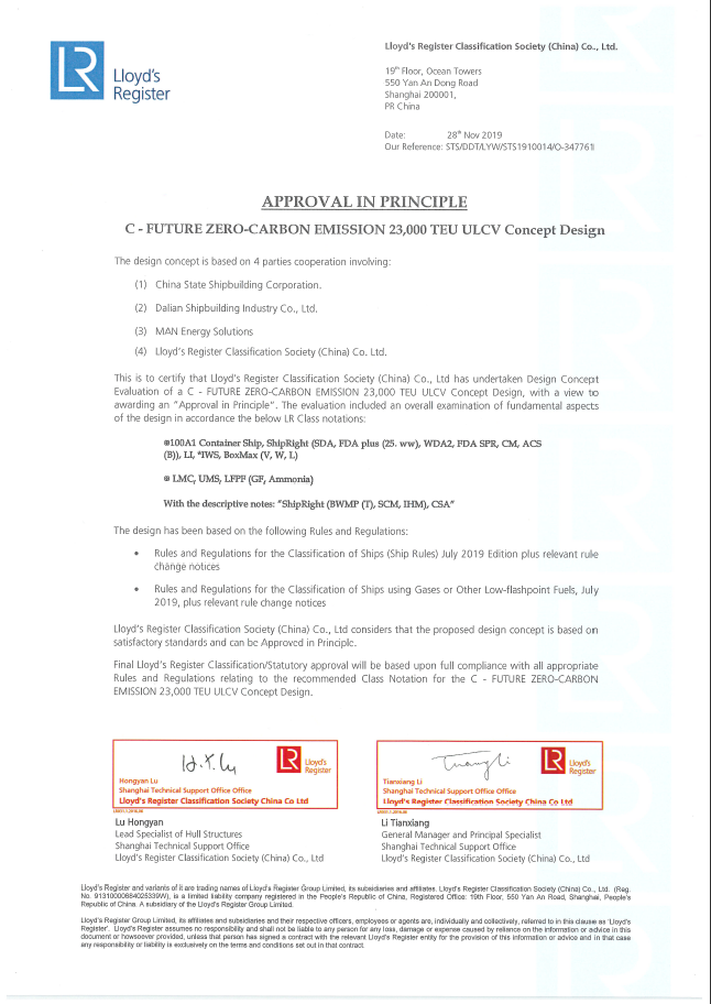 2020年,大船集團研發的液氨動力超大型油船(VLCC)分別取得美國船級社(ABS)和中國船級社(CCS)頒發的AIP證書。