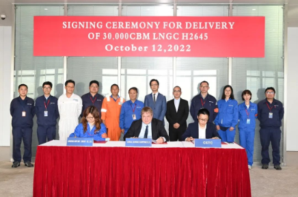 10月12日,中國船舶集團旗下江南造船為荷蘭船東Anthony Veder公司設計、建造的30000立方米液化天然氣(LNG)運輸船“Coral Nordic”號在上海簽字交付。