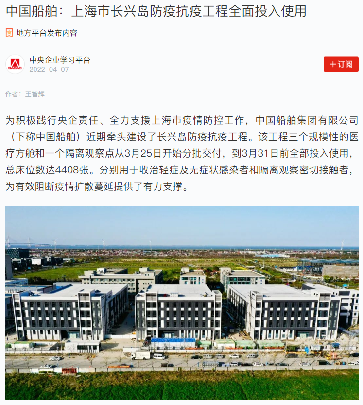 中國船舶:上海市長興島防疫抗疫工程全面投入使用